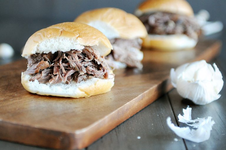 My mother-in-law recently treated us to some tasty open faced shredded roast beef sandwiches. She made the roast beef in her crockpot / crock-pot / slow cooker and added a bottle of heavy stout beer. Those sandwiches were so good. I decided to test out her recipe but instead of using beer, I used a bold coffee. You can’t really taste the coffee in this recipe (just like you couldn’t really taste the beer in hers) but the roast beef was so incredibly tender and rich in flavor. I’ve since made this recipe again and have turned my family into big roast beef fans.