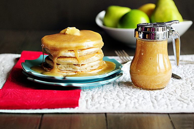 I made something today that kind of blew my mind. In fact, after it was done cooking, I stuck a spoon into the pot, took a lick and “mmmmmmmmm’d” so loud my 2 year old came running into the kitchen saying, “Is good, mama? Is good?” I continued to spoon the golden goodness into my mouth, ignoring her pleading eyes and simply answering her inquiry by nodding my head and saying “mmmmmmmm”. This golden goodness that rendered me almost speechless is Eggnog flavored pancake or waffle syrup! Indulgent, right? Even though I’m not a huge eggnog fan, I do love eggnog flavor. I also really enjoy flavored pancakes, but often am disappointed when the flavor doesn’t come through loud and clear. My solution to my dilemma was to make a syrup so rich and tasty, you’d have no doubt what flavor it was.