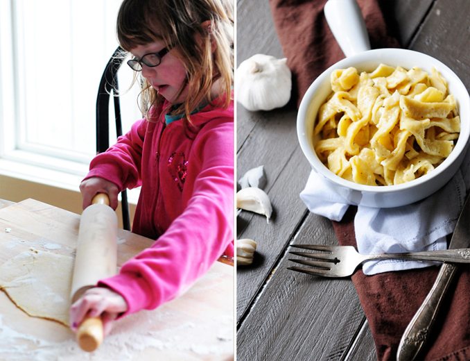 Obviously, since I am a “foodie”, getting my kids involved in dinner prep is an obvious way to share in the chore. It is definitely not easy to cook with kids, and it oftentimes makes dinner prep take longer, but their sense of accomplishment after being a significant part of dinner far outweighs the challenging aspects of having them help. Above, Ella took on the job of rolling out the homemade pasta dough for Garlic Butter Egg Noodles.