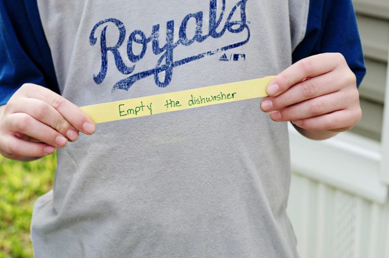 Just like adults, kids get bored doing the same chores week after week. We solve that problem by putting our usual list of chores (empty the dishwasher, set the table, take out the trash, etc) into a bucket that they can draw from each week. Each child is responsible to complete the chores they draw for that specific week. Then, the next week we do it all over again!