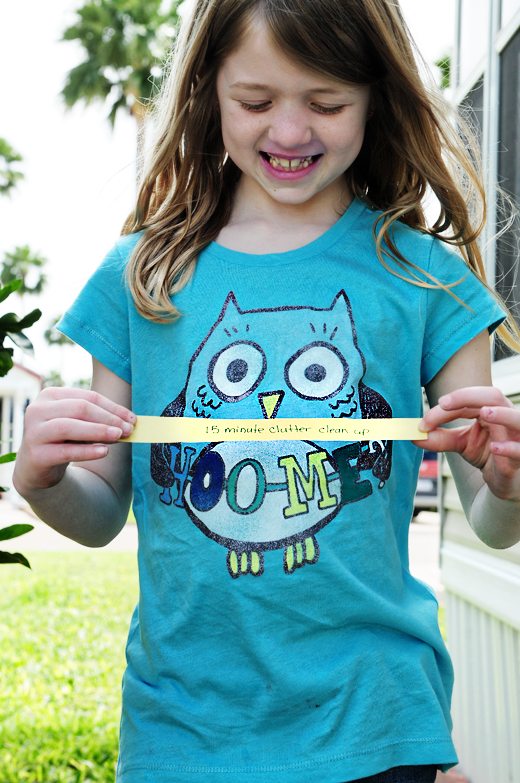 I learned a tip from FlyLady a long time ago and that is to set a timer for 15 minutes and see how much you can get done. We do this often in our house and it really gets the kids moving. Set a timer and focus on a specific room in your house. Move as fast as you can to get as much as you can done in 15 minutes!