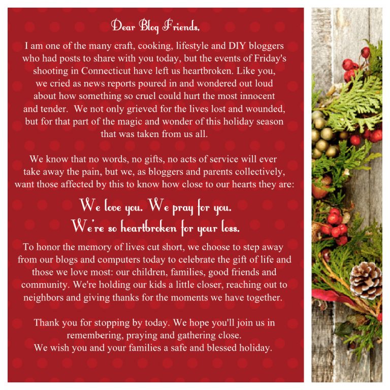 I am one of the many craft, cooking, lifestyle and DIY bloggers who had posts to share with you today, but the events of Friday's shooting in Connecticut have left us heartbroken. Like you, we cried as news reports poured in and wondered out loud about how something so cruel could hurt the most innocent and tender. We not only grieved for the lives lost and wounded, but for that part of the magic and wonder of this holiday season that was taken from us all.  We know that no words, no gifts, no acts of service will ever take away the pain, but we, as bloggers and parents collectively, want those affected by this to know how close to our hearts they are:  We love you. We pray for you. We're so heartbroken for your loss.  To honor the memory of lives cut short, we choose to step away from our blogs and computers today to celebrate the gift of life and those we love most: our children, families, good friends and community. We're holding our kids a little closer, reaching out to neighbors and giving thanks for the moments we have together.  Thank you for stopping by today. We hope you'll join us in remembering, praying, and gathering close. We wish you and your families a safe and blessed holiday