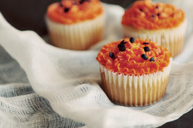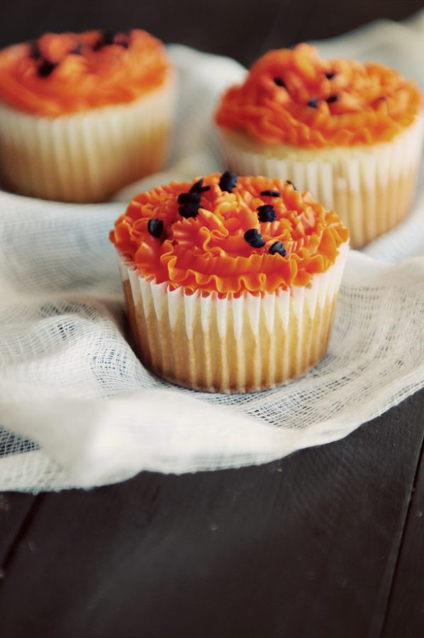So, last night, after fretting all week about what to make, and wishing I lived back in the days when a sucker wrapped in tissue with eyes marked on it with pen was fancy, I decided to just do something simple and make cupcakes. Not even cupcakes that look like jack-o-lanterns… simple, plain, white cupcakes with orange butter cream frosting.