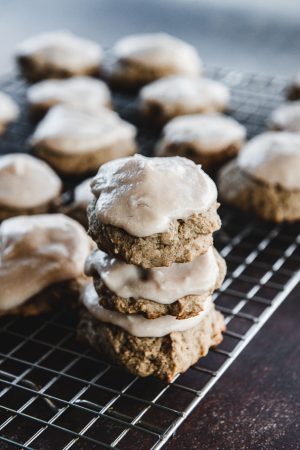 Image is a stack of 3 double chocolate drop cookies with chocolate frosting on a cooling rack