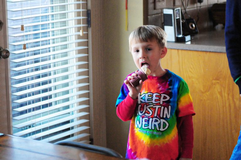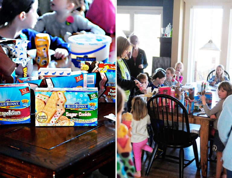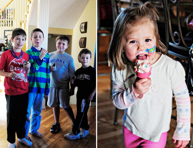 Then I thought…”Wait, Kristen… your word for 2012 is Connect. Open your home more, despite the fact that your floors may not be in the most pristine condition.The people you care about aren’t going to give a flip about your floors!” So, I did just that. At almost noon I put a post out on Facebook letting friends and neighbors know we’d be having an impromptu Blue Bunny Ice Cream party at 3pm. Come one, come all.