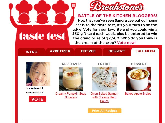 Head over to the Breakstone’s Better Homes & Gardens Holiday Showdown page to cast your vote. Voters will be entered to win a weekly drawing for a $50 gift card. In addition, one lucky voter will win the $2500 grand prize. Voting on the Holiday Showdown entries on the contest page will immediately enter you into the grand prize drawing. Thanks for voting and good luck!