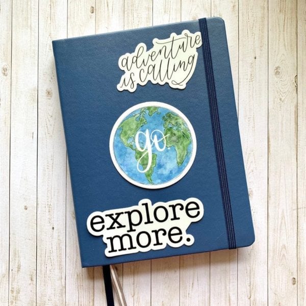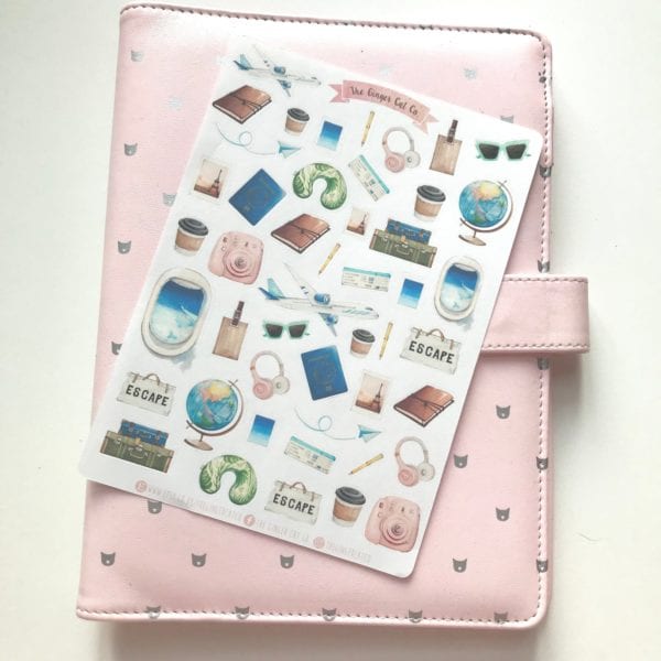 Travel sticker sheet on a pink notebook