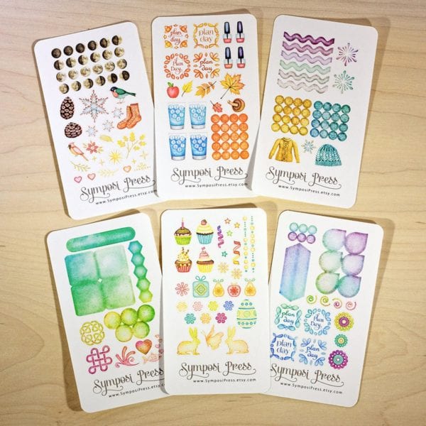 6 sticker sheets on wood background from Symposi Press Etsy store