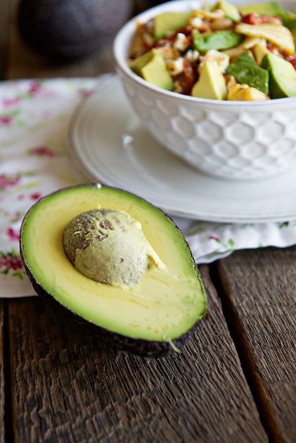 This means it’s that time of year where we get beautiful California Avocados delivered to our doorstep, then we continue to eat them in absolutely everything. In fact, Leah and I will often just slice open an avocado, sprinkle it with Kosher salt and pepper, and count that as our lunch. She’s my little avocado eater…last week she ate 3 in one day. Then she had a giant bowl of this marinated salad!