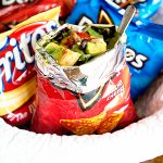 I’VE GOT ONE BETTER (OR MAYBE TWO) ELIMINATE CHIPS ALTOGETHER. USE SMALL SIZE FREEZER BAGS INSTEAD. CHIPS BAGS ALWAYS SEEM TO TEAR & THERE’S NOT STOPPING IT ONCE IT STARTS. PUT ALL INGREDIENTS (?) INTO A LARGE/GALLON FREEZER ZIP LOCK BAG & TOSS GENTLY. THEN CAREFULLY PUT FOOD INTO SMALL FREEZER BAGS. IF YOU DON’T LIKE THE PLAINNESS OF THE BAGS, YOU CAN GET A COUPLE OF DUCT TAPE ROLLS (THEY COME IN DIFFERENT DESIGNS NOW!) & CUT DESIGNS OUT AND PUT THEM ON THE BAGS. ALSO IF YOU REALLY CAN’T IT ALL ( YEAH, RIGHT!) YOU CAN ALWAYS ZIP IT UP & PUT IT IN THE COOLER FOR LATER.