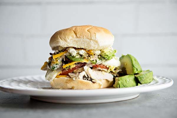 - On a bottom bun, layer chicken, bacon, tomatoes, eggs, lettuce, cheddar cheese, California avocados, and blue cheese crumbles. Top with the other half of the bun and serve.