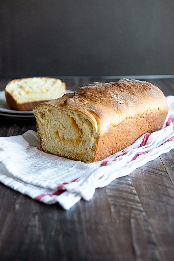 I adapted from this bread recipe because it can be extremely versatile! I added 1 cup of shredded sharp cheddar to the dough before rolling it up and the result was an extra cheesy loaf of fresh baked bread!