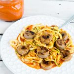 Chicken Sausage with Roasted Red Pepper Sauce over Zucchini Noodles