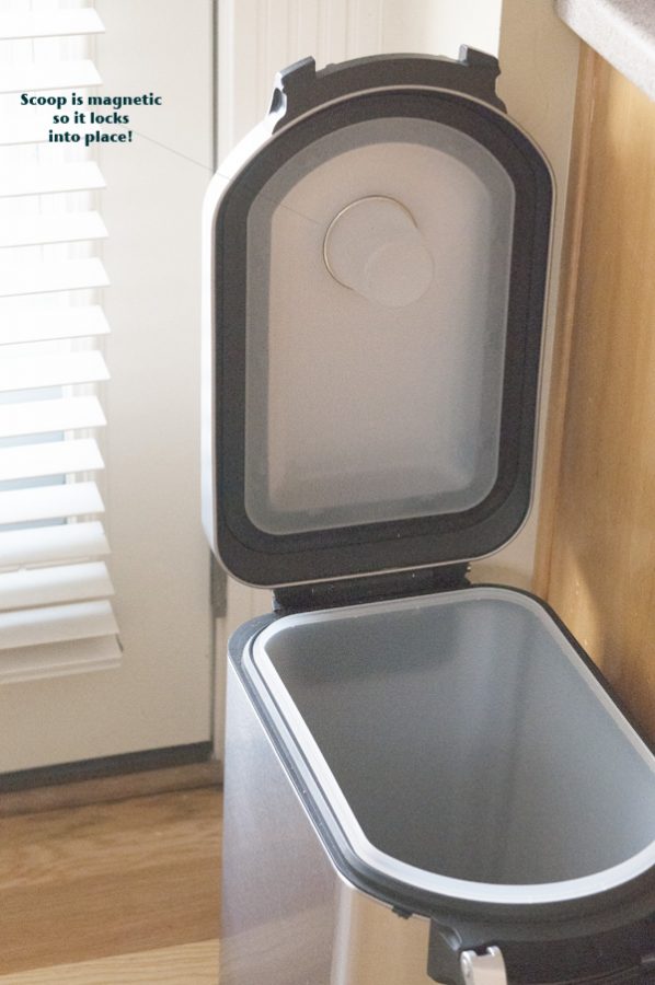 Magnetic-ScoopI love that I can keep it out in the open, right next to her dog food bowls, and it looks pretty out, blending in well with my kitchen style. I also think it’s genius that the scoop is magnetic and clicks onto the lid. No more digging to the bottom of a full can of food to search for the scoop!