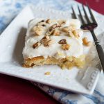 Vanilla Texas Sheet Cake is a twist on a classic church potluck recipe, topped with a creamy vanilla frosting and chopped Diamond walnuts.