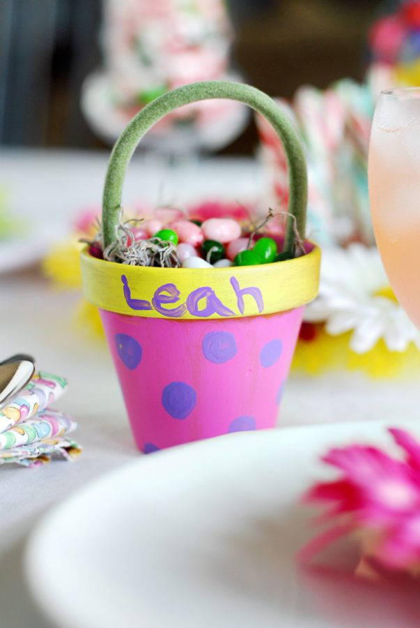 […] Easter Celebration Tablescape with Breakstone's Sour Cream | Dine … For the place holders I simply painted the inside and outside of a small, 2-inch Terra Cotta pot using acrylic paint in a variety of spring colors. Once painted, I added the guest name on the rim of the pot. To reduce waste, I took the stem of an artificial Gerber Daisy (which I used in another part of the tablescape) and created a handle for the pot, hot gluing it to the inside. I filled the pot with Spanish Moss, then topped with a handful of jelly beans. […]