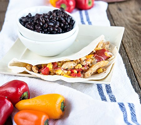 • Combine the chicken, corn, roasted red peppers, chili powder, cumin, minced garlic, minced onion flakes and salt in a large skillet over medium heat. Stir until heated through. Warm the tortillas and keep warm until ready to serve.