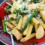 - Toss pasta with chicken and asparagus mixture. Plate and sprinkle each serving with Parmesan cheese