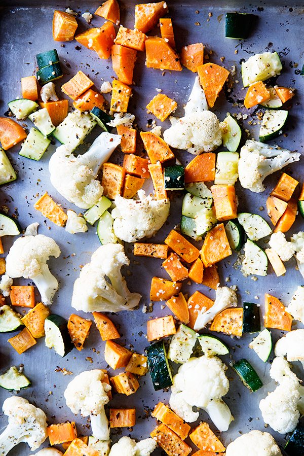 My favorite vegetables to roast together for a quick and healthy side are sweet potatoes, cauliflower and zucchini, however, just about any vegetable can be swapped out. The only vegetable I don’t really love roasted is broccoli – I prefer it steamed – but other than that, there are so many great vegetables out there that taste great roasted!