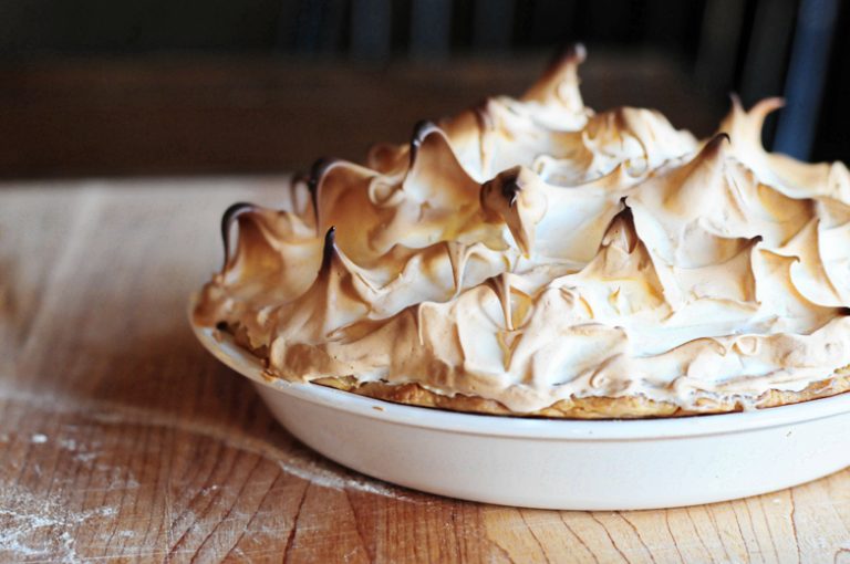 4. Spoon onto pie, sealing edges and using back of spoon to create “peaks” in the meringue.