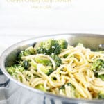 The original recipe calls for linguini but you can substitute spaghetti or angel hair pasta as well. In the end you have a quick cooking pasta dish with flavorful bits of minced garlic and parmesan cheese. What’s best is there’s even no need to drain the cooked noodles . It all simmers in one pot and the liquid absorbs resulting in a pasta dish bathed in a creamy garlic sauce.