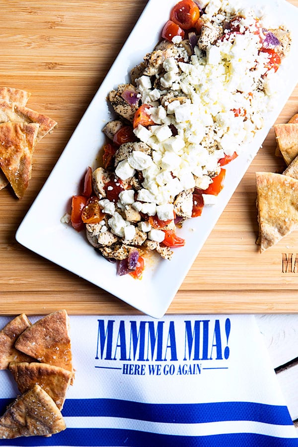 This Greek Feta Chicken Appetizer served with baked pita chips is an ideal way to celebrate the Digital and Blu-Ray/DVD release of Mamma Mia! Here We Go Again!
