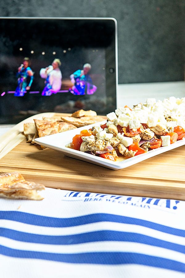 Of course, it’s not a Mamma Mia Movie Night In without a Greek inspired appetizer. This Greek Feta Chicken Appetizer is a deconstructed version of our favorite pita fillings. It’s simple enough to be a great appetizer or filling enough to be dinner. Whatever you are in the mood for, this Greek Feta Chicken Appetizer is a must for movie night!