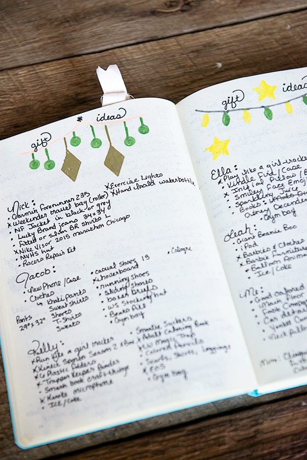 Next, I have a 2 page spread of gift ideas for my family (and myself).This notebook will be with me long past the holidays, so it’s a way I can keep track of ideas all year long, in one notebook!