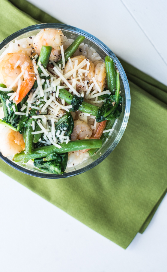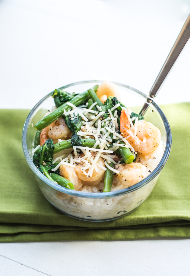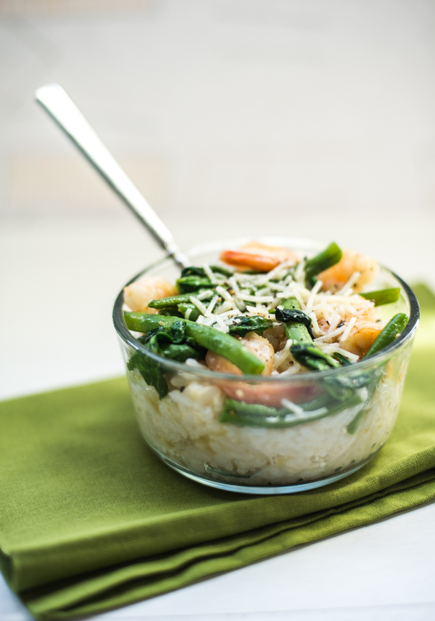 - Add the green beans and cook until tender, about 5 minutes. During the last minute of cooking time, add the spinach. Stir together. Serve shrimp and veggies over the cooked risotto. Sprinkle with salt and pepper then top with remaining 1/4 cup parmesan cheese