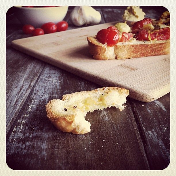 For the Naturally Softer Irish Butter, I took 1/2 cup butter and added 3 tablespoons shredded KerryGold Blarney Castle cheese, 1 teaspoon garlic salt and 1 teaspoon cracked black pepper and blended it together. I then spread this delicious combination on some slices of French baguette. I placed it in the oven at 450 for a few minutes until it was slightly toasted. I then added a combination of items sauteed in the same butter compound… artichoke hearts, halved grape tomatoes, minced garlic and diced onion. I placed the sauteed mixture evenly on top of each baguette slice, shredded a bit more Blarney Castle cheese on top, put it back in the oven, and let it bake for an additional 3 minutes, until the cheese was melted. During my photo shoot I got a bit hungry and just couldn’t help taking a nibble… or two or three.