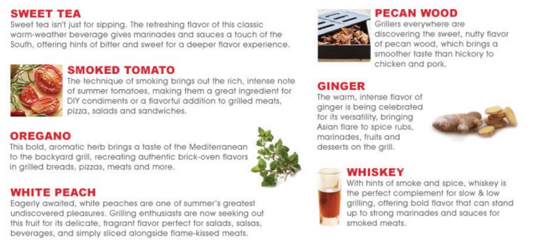 According to the experts at McCormick, the flavors to watch this summer are Sweet Tea, Pecan Wood, Smoked Tomato, Ginger, White Peach and Whiskey.