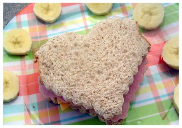 • Shapes – Turn a boring old sandwich into something fun simply by using a large cookie cutter and cutting the sandwhich into a fun shape. We did hearts and I plan on doing shamrocks for St Patrick’s Day. My picky 3 year old who usually picks her sandwiches apart, ate the entire thing and loved every bit of it!