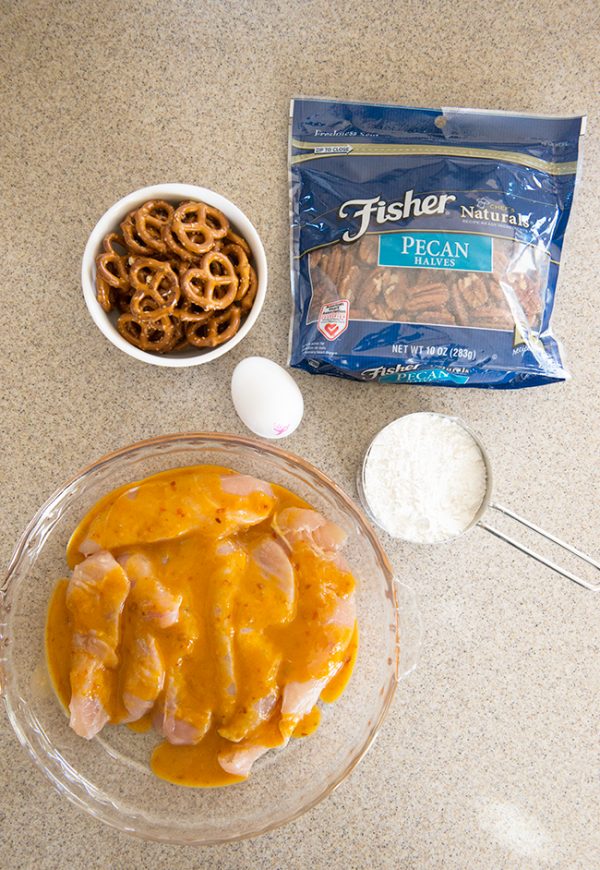 Bored with plain old chicken? Give these simple Pecan and Pretzel Crusted Baked Chicken Tenders featuring Fisher® Nuts a try to switch things up at your dinner table!