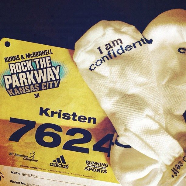 Friday, April 13: Today I picked up my packed and race bib for my first 5K tomorrow. I also snagged up a new pair of Notes to Self socks, hoping that the message would soak in! Feeling very sore and tired from my workout yesterday and nervous about running the 5K off of the treadmill. We shall see! (I now know I successfully completed the 5K! Will share more about it later in the week. In a word, it was fantastic and my socks worked!) Taken with my iPhone.