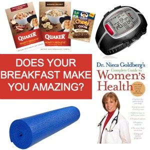 Quaker oatmeal bowl and products, a yoga mat, Dr. Nieca Goldberg’sComplete Guide to Women’s Health, Quaker Oats heart-healthy recipes and a heart rate monitor. (ARV: $250).