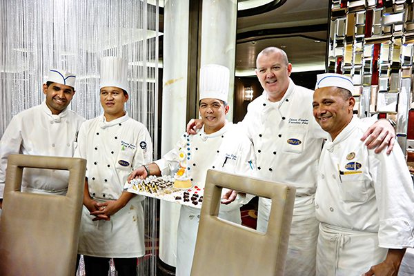 3 of the nights during a 7 day cruise, Princess offer guests the opportunity to dine at the Chef’s Table (known as The Chef’s Table Lumiere). This is a very exclusive opportunity, as they only take 8 people each night. As you can guess, 12 people out of the thousands on board means this event sells out very fast and is one hot commodity. The price per person for this event is currently $115. With that $115 you get a tour of the kitchen, time to interact with the head chef, the royal treatment, champagne, appetizers, fine wine with every course, and a more course meal than I could keep track of. The food and wine just kept coming and coming and coming. In addition you get a fantastic Princess Cruises cookbook (ARV $50) and professional photos taken as a group and with the chef.