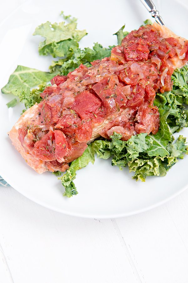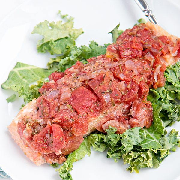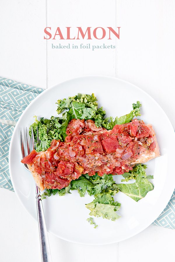- Place a salmon fillet, oiled side down, atop a sheet of foil. Wrap the ends of the foil to form a spiral shape. Spoon the tomato mixture over the salmon. Fold the sides of the foil over the fish and tomato mixture, covering completely; seal the packets closed. Place the foil packet on a heavy large baking sheet. Repeat until all of the salmon have been individually wrapped in foil and placed on the baking sheet.
