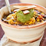 - Remove from heat and ladle into bowls. Garnish with a generous tablespoon of Wholly Guacamole, shredded cheese and baked tortilla strips or chips.
