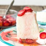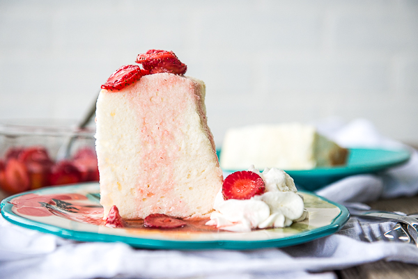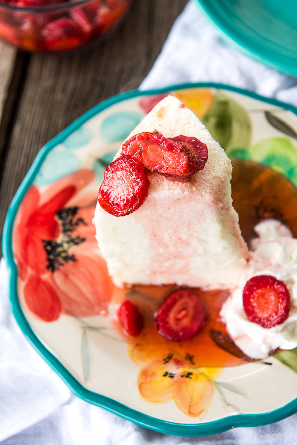 Image is two slices of homemade angel food cake on a floral plate topped with strawberries