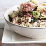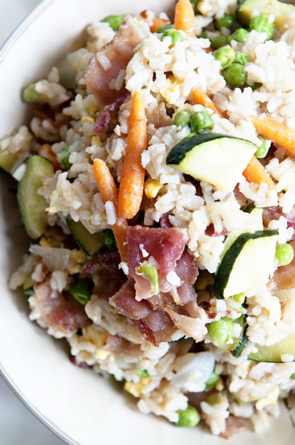 Kristen, any fried rice that starts with bacon is the perfect fried rice. We’ve been eating a LOT of zucchini this summer because we’re getting it nearly every week in our CSA box. One of my favorite ways to enjoy it? Diced, with mushrooms and yellow squash, tossed with olive or canola oil, salt, pepper and garlic, and then grilled or sauteed. There have been some nights we’ve simply added a baked potato and called it dinner.